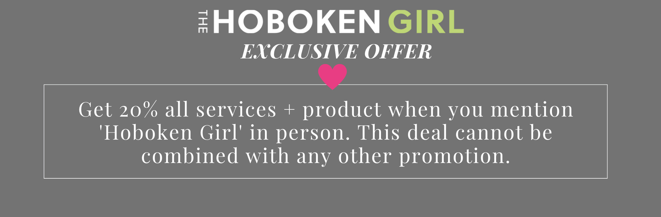Don’t forget to mention Hoboken Girl in person to receive 20% off all services + products. This offer cannot be combined with any other promotion.