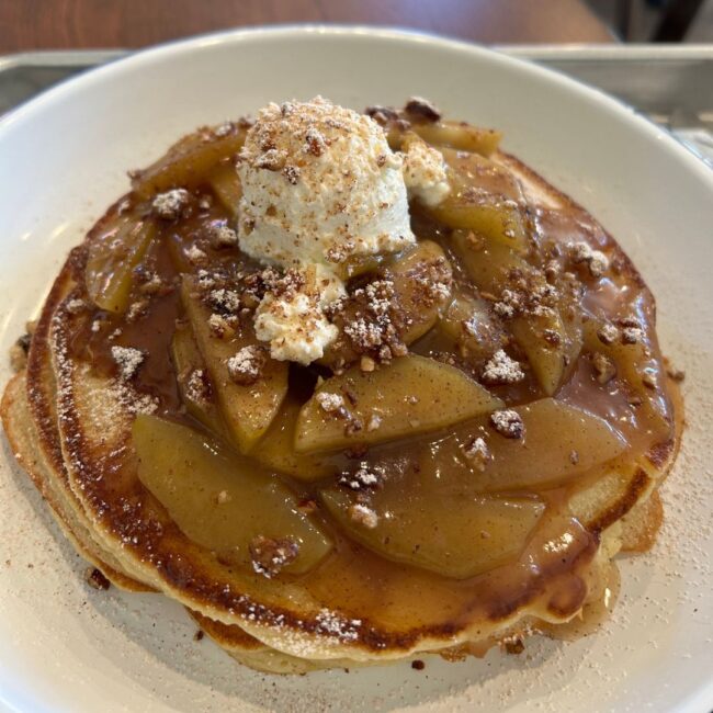 The team recently added a few fall items to the menu, including Apple Pie Pancakes, Autumn Toast, and a Fall Caesar Salad. We asked the owner, Steve El, what his favorite of these was, and he said the Apple Pie Pancakes. The dish features the lemon ricotta pancakes, topped with an apple pie compote, candied pecans, ricotta, and powdered pumpkin spice – ideal for a Sunday morning brunch.