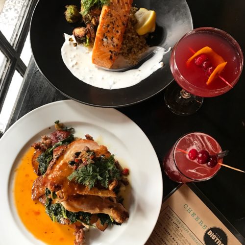 City Bistro’s Pressed Half Chicken {with braised dinosaur kale, potato sausage hash, olive tapenade, and chicken au jus} + Pan Seared Salmon {w/cauliflower rice, fried Brussels sprouts, tzatziki sauce} are seriously just what the doctor ordered when it comes to comfort food.