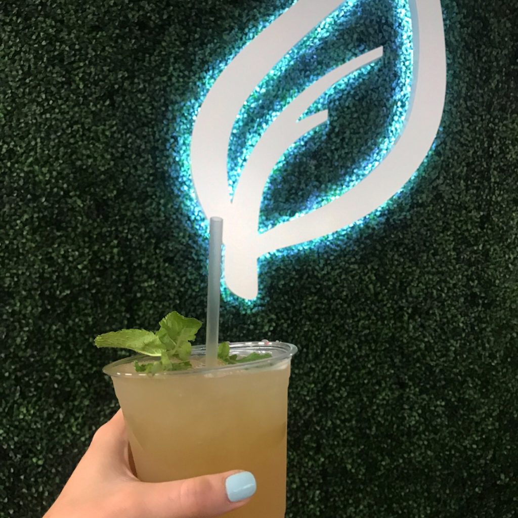 Baby spinach, arugula, mango, quinoa, goat cheese, toasted almonds, balsamic vinaigrette, with a side of Mint Lemonade.