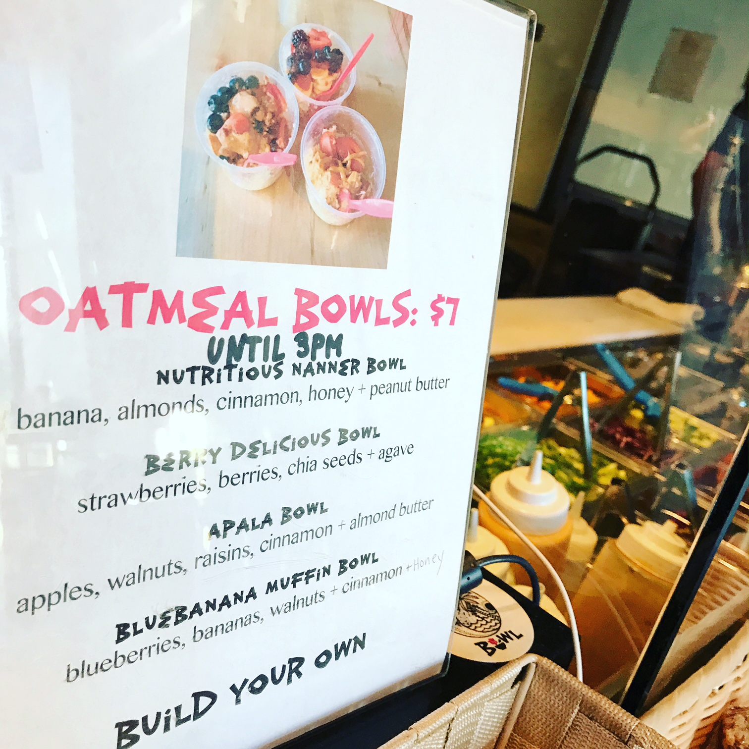 For the breakfast crowd, they also serve oatmeal bowls, local tea, coffee, and nitro cold brew — making it a go-to brekky spot for anyone west of Willow Ave. You can build you own bowl or order one of the pre-selected menu items — which they then make fresh on the spot.
