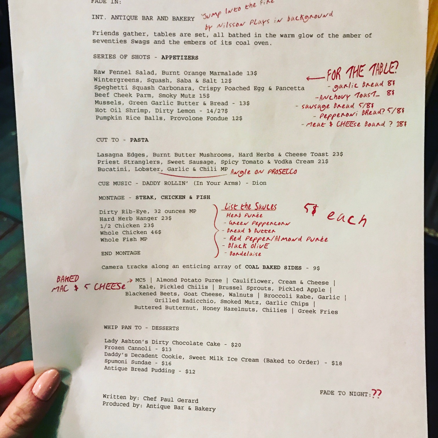 Speaking of the menu, it is noteworthy to mention the unique, carefully-tailored details that go into the new space are all as a result of Joe’s filmmaker background. Case in point? The menu! No, the below isn’t a “draft” of the menu, it’s the actual printed menu that everyone who dines at the space will receive at their table which is created to imitate a film script, adding to the charm of the space and “old Hoboken” vibes. Lurve. [PS: Pumpkin rice balls with provolone fondue, we’re comin’ for ya].