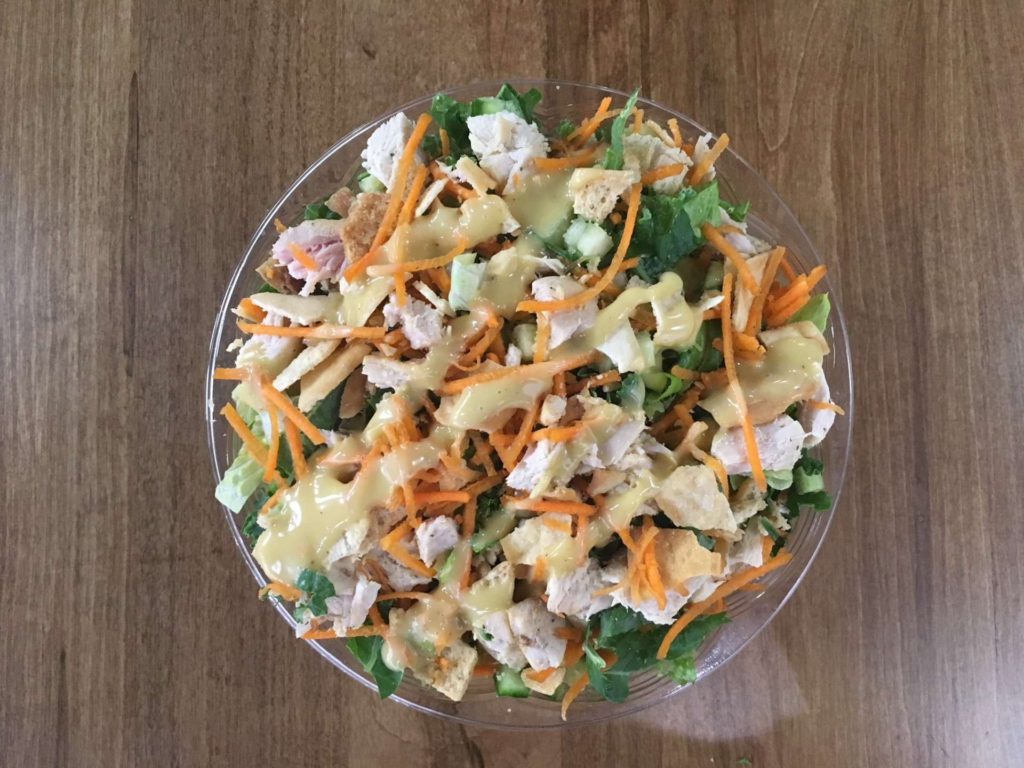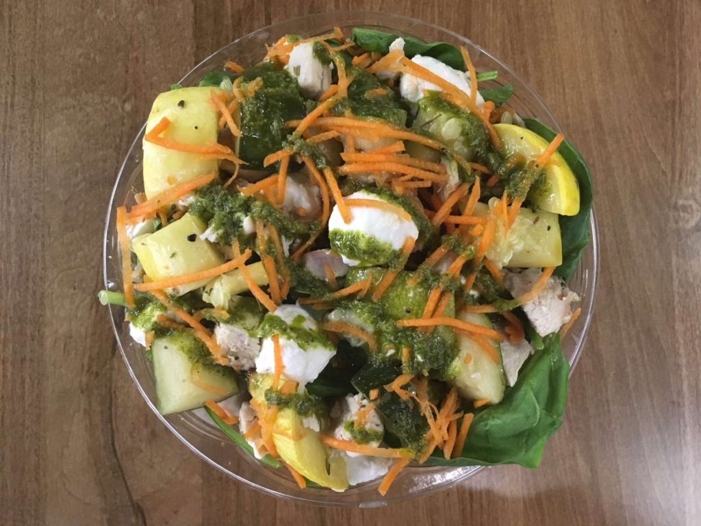 Baby spinach, shredded kale, roasted chicken, summer squash, mozzarella, carrots with a pesto vinaigrette.