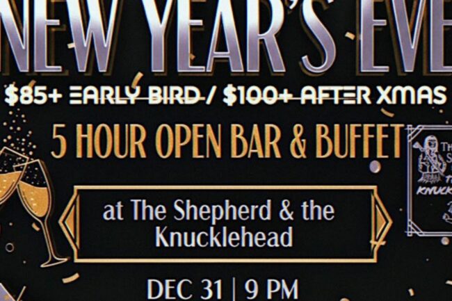 Welcome to the ultimate New Year’s Eve celebration at The Shepherd & the Knucklehead of Hoboken. Think of it as a night of non-stop drinks, food, and fun, featuring a five hour open bar and buffet. The epic event includes party favors (while supplies last), a champagne toast at midnight, sound on for the ball drop, and a DJ and dancing all night long.