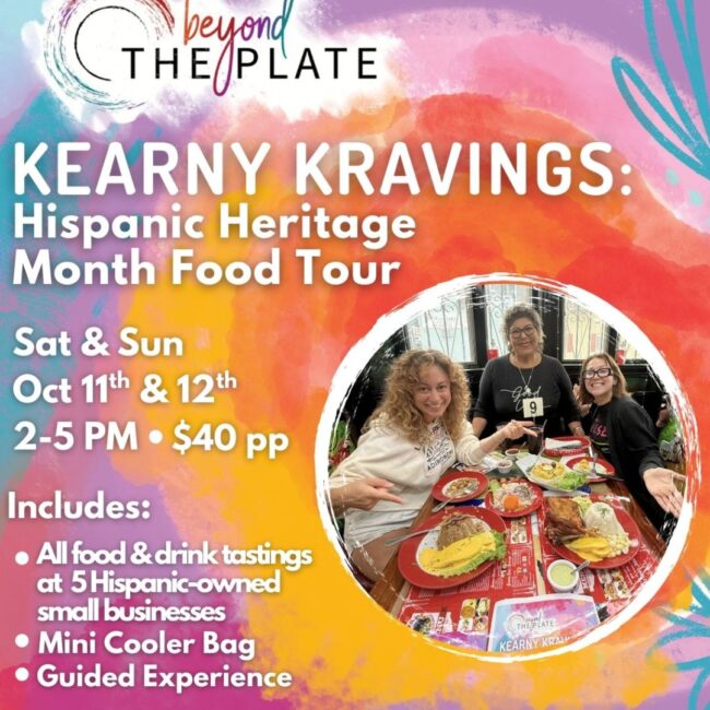 Jersey City foodie and entrepreneur Alessia Aron is set to host a Hispanic Heritage Month Food Tour through downtown Kearny, New Jersey. The event is presented by Beyond the Plate and Kearny Urban Enterprise Zone. It will feature visits to several Hispanic-owned eateries along the walking tour. This is the second-ever Kearny Kravings event, the first of which was a dessert crawl that took place in July. Read on for more details about the food tour event happening in Kearny on October 11th and 12th, 2025.